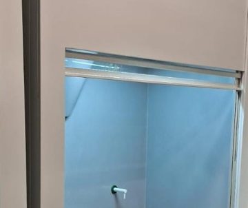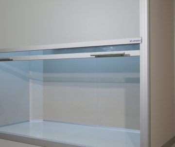 Подъемный экран уравновешен системой противовесов, позволяющей плавно регулировать высоту подъема стекла от полностью закрытого до полностью открытого состояния с фиксацией на любом уровне без изменения габаритов высоты шкафа.